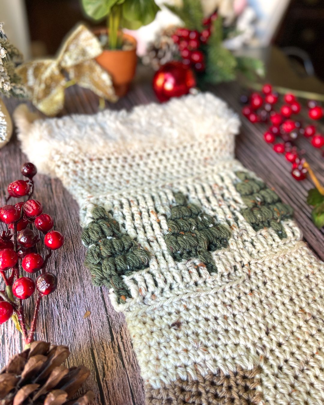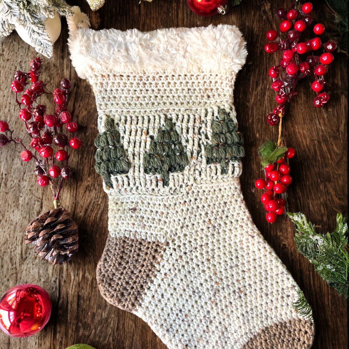 Easy puffy pine tree crochet Christmas Stocking Crochet pattern with rustic vibes. Includes mosaic crochet aspects too!