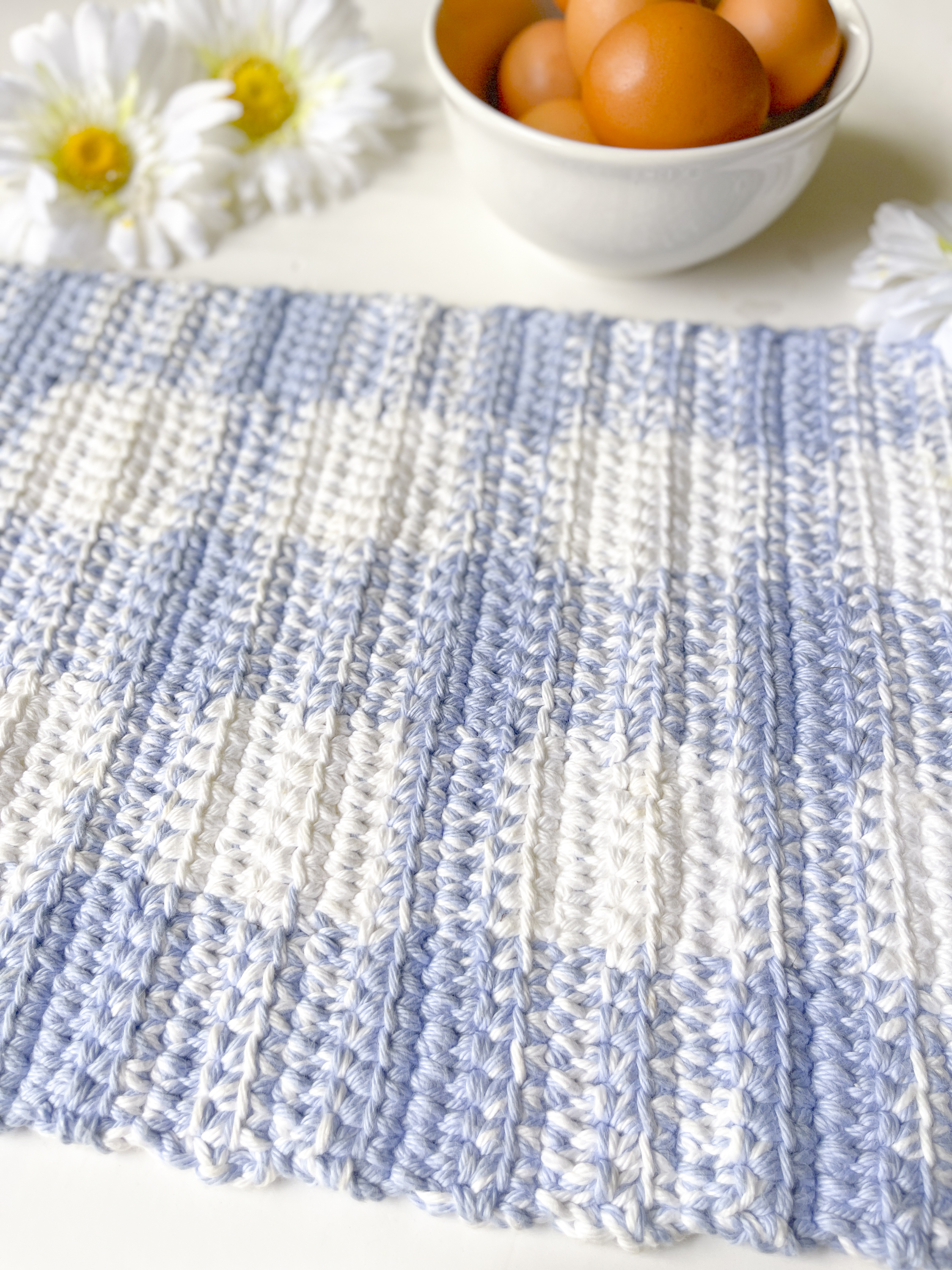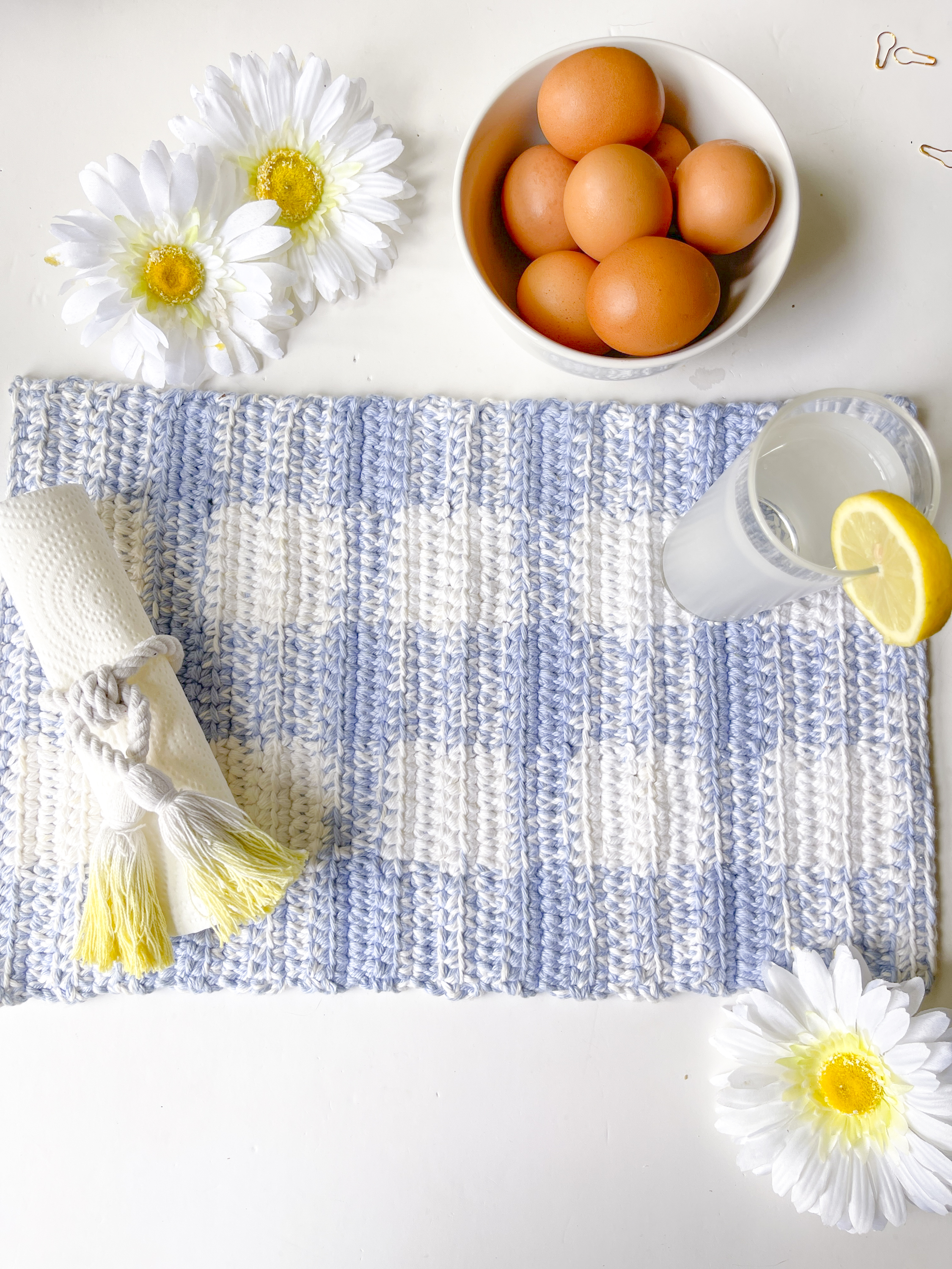 This adorable crochet placemat pattern is so easy to make, it only looks hard! This pattern uses two strands of different colored yarn to create this beautiful gingham plaid pattern.